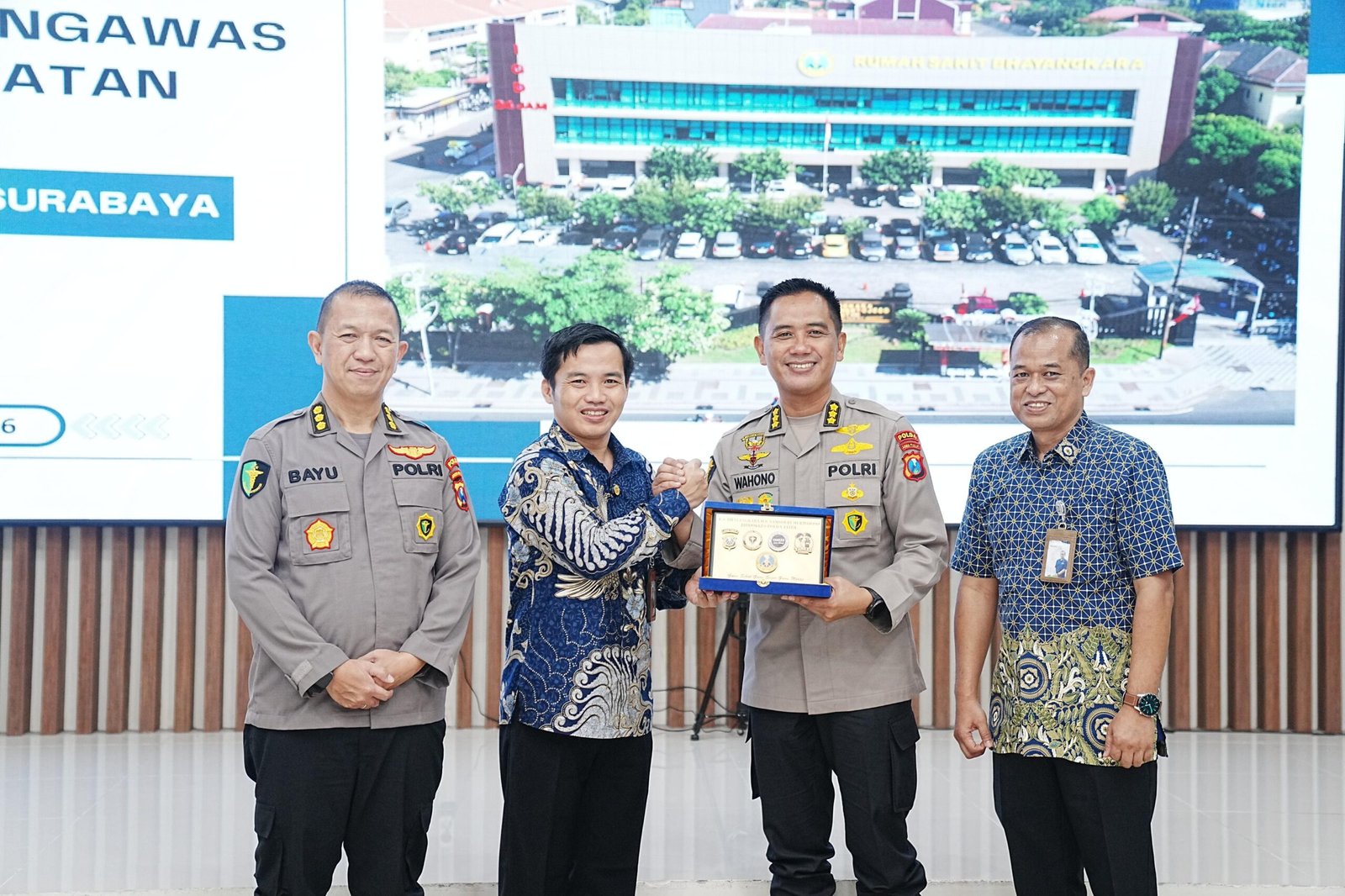 Rombongan Dewas BPJS disambut oleh Kabid Dokkes Polda Jawa Timur Kombes Pol dr. Wahono Edhi serta Karumkit Bhayangkara Surabaya, Kombes Pol Bayu Dharma Shanti.